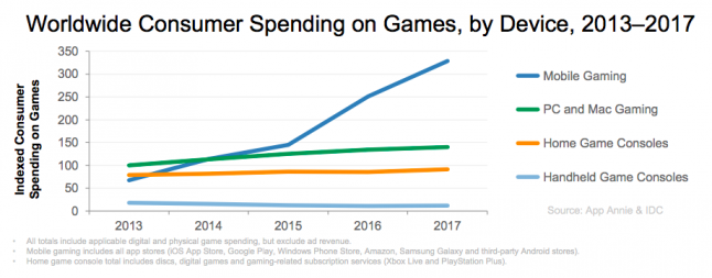 Spending on mobile games was 3.6 times greater than spending on home game consoles and 2.3 times greater than that of PC and Mac games, reports industry analyst firms App Annie and IDC.