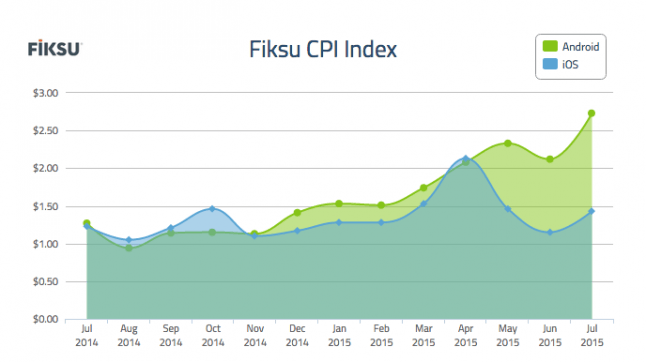 Still, while Fiksu suggests that CPI rates usually rise during the summer due to a seasonal slowdown, it’s remarkable to see how much more expensive it can be to get your game noticed by Android users. For more details on the index (and more graphs like the one below), check out Fiksu’s blog post on the topic.